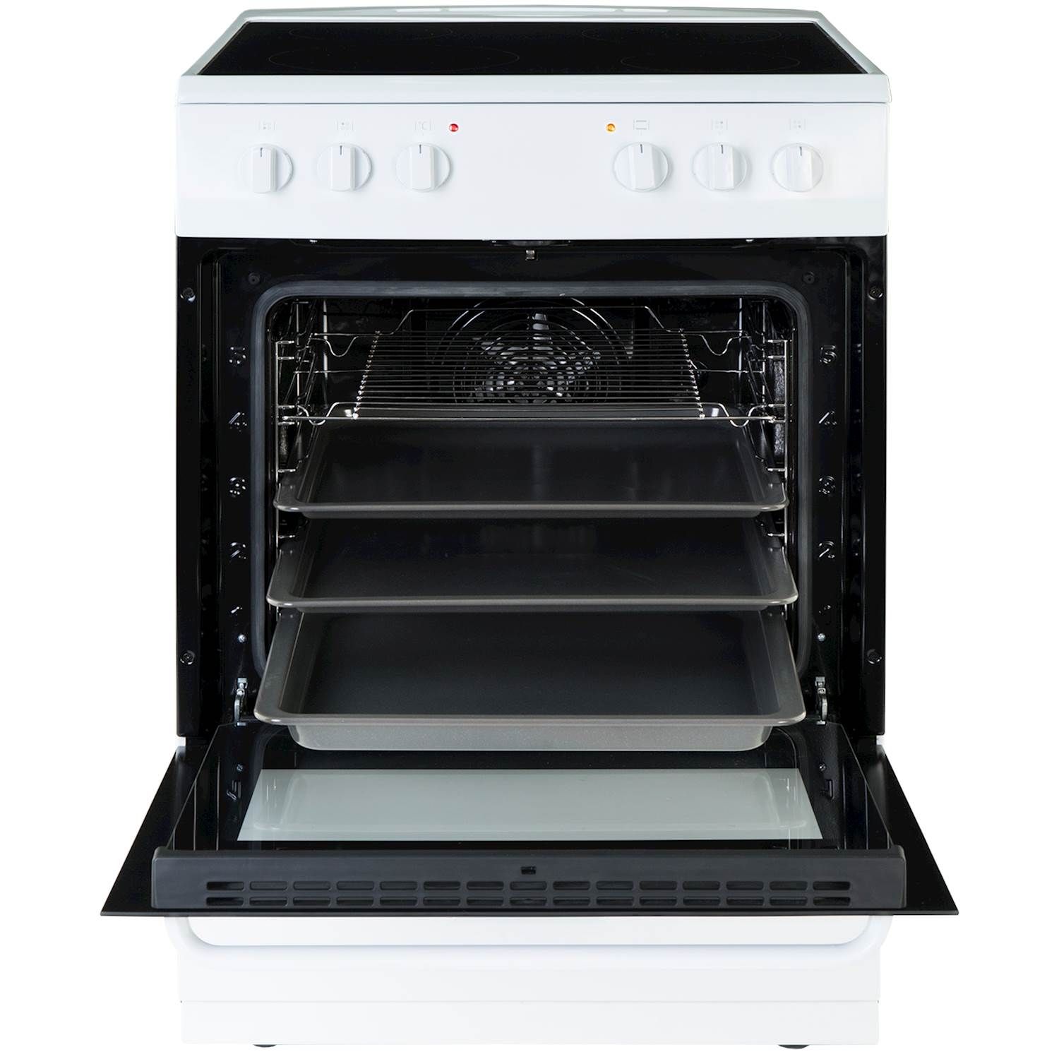 Komfuret har en keramisk kogeplade med fire kogezoner. Du regulerer varmen med de fleksible drejeknapper.