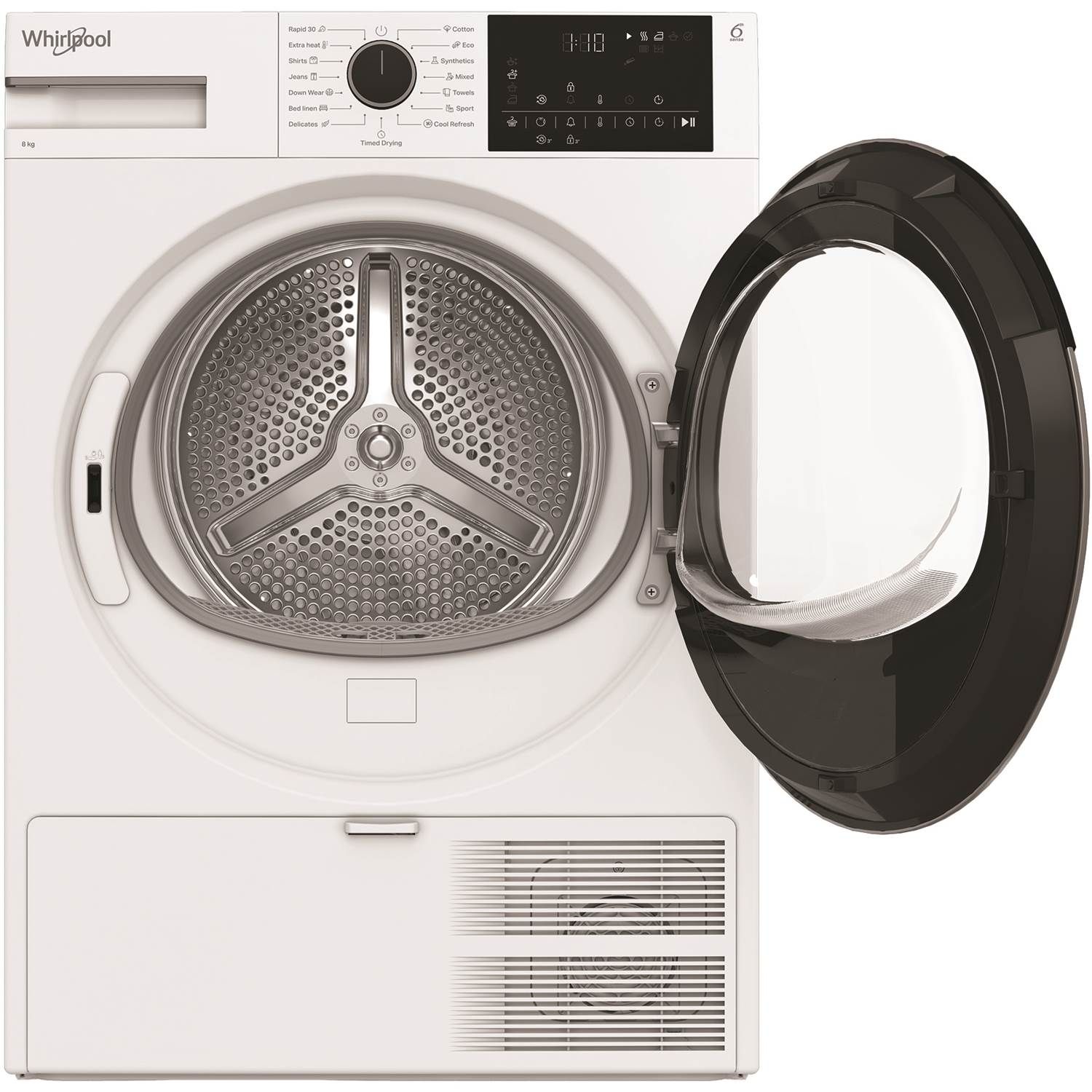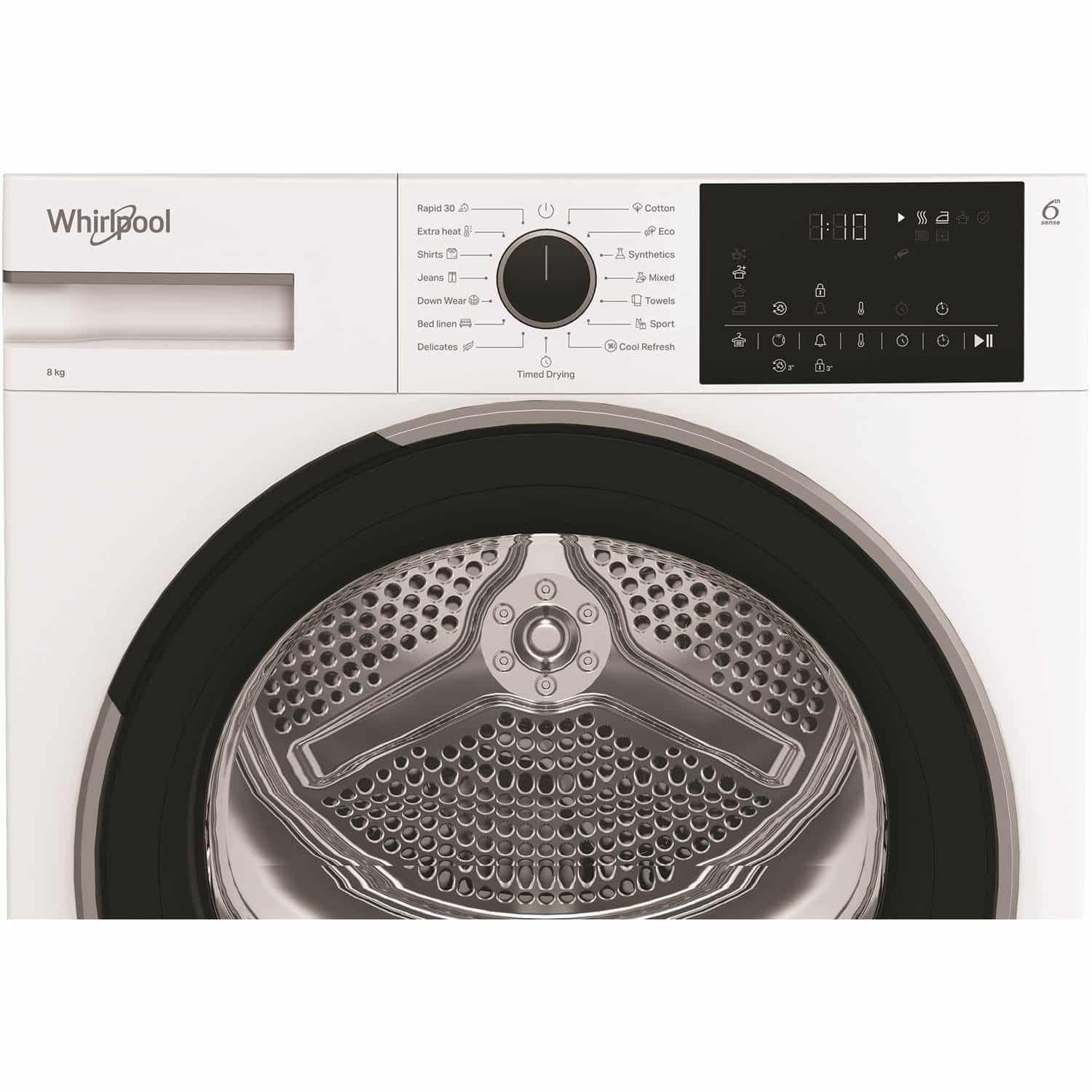 Whirlpools Precision Dry-teknologi, drevet af 6th Sense, justerer automatisk vaskeprogrammet ved at registrere fugtigheds- og temperaturniveauer for at forhindre overtørring.
